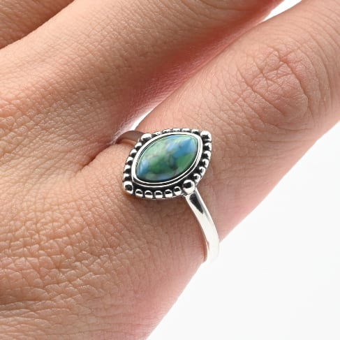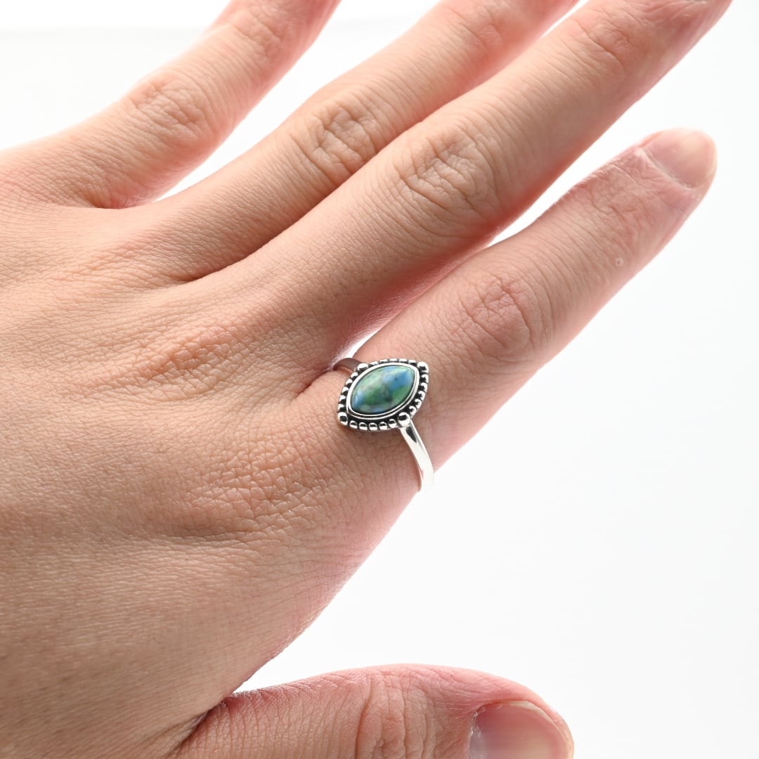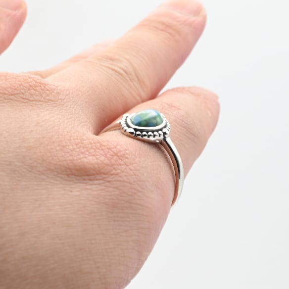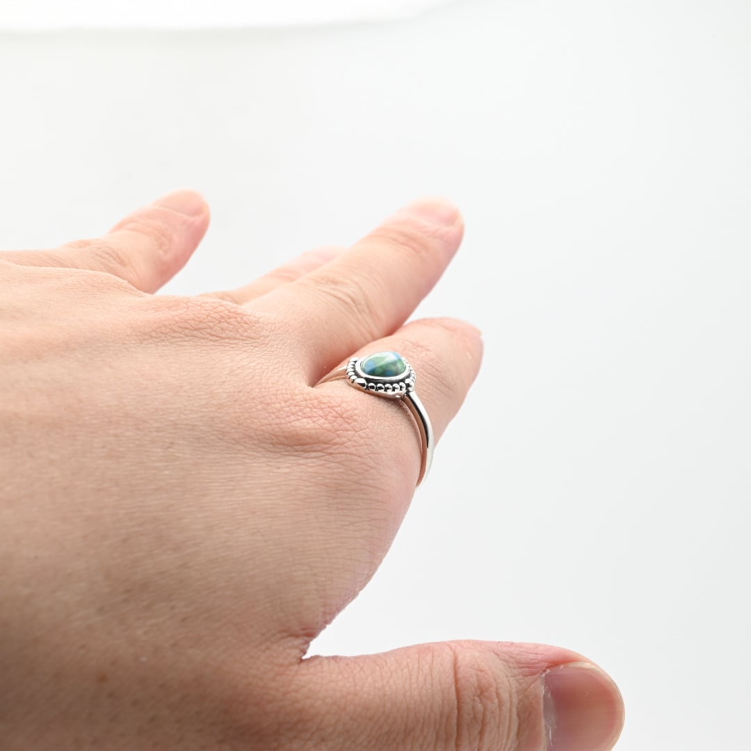 美しいブルーグリーンのストーンが目を惹くアイテム。