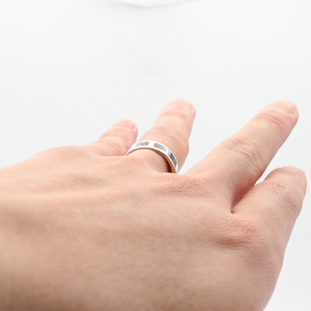 一周ぐるりと、美しいパープルストーンが配されたバンドリング。
