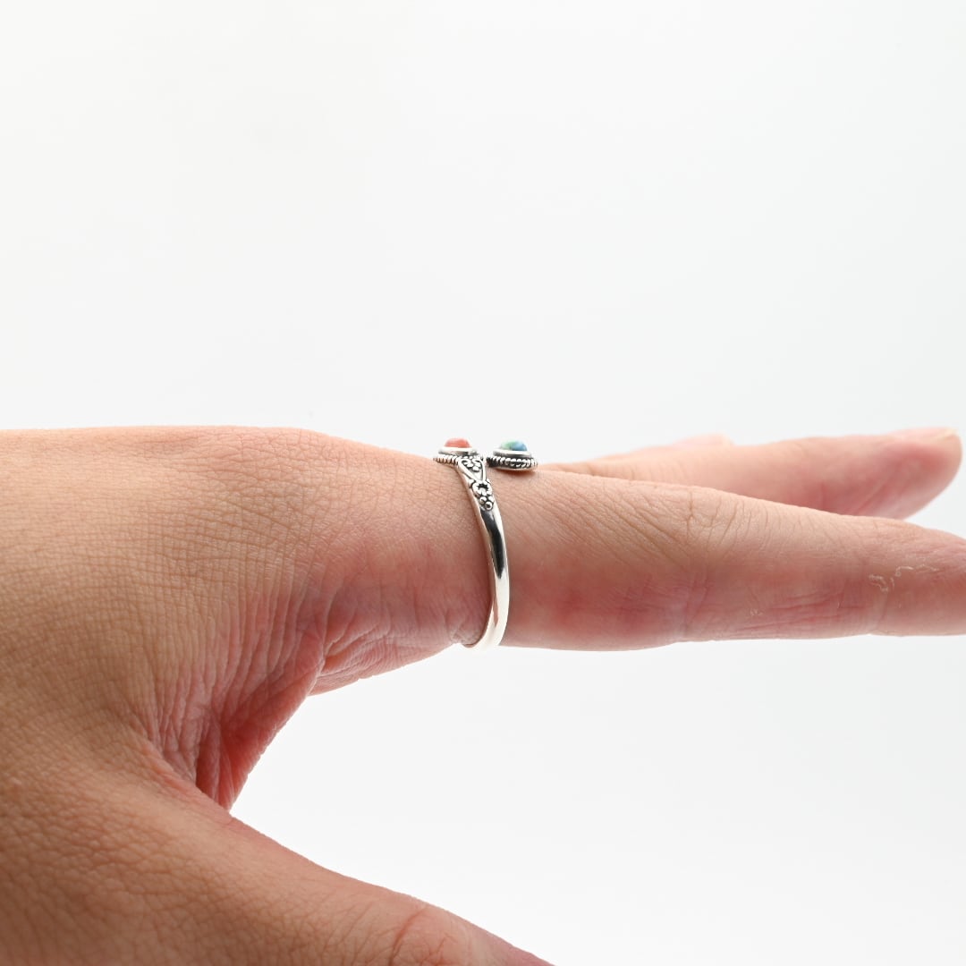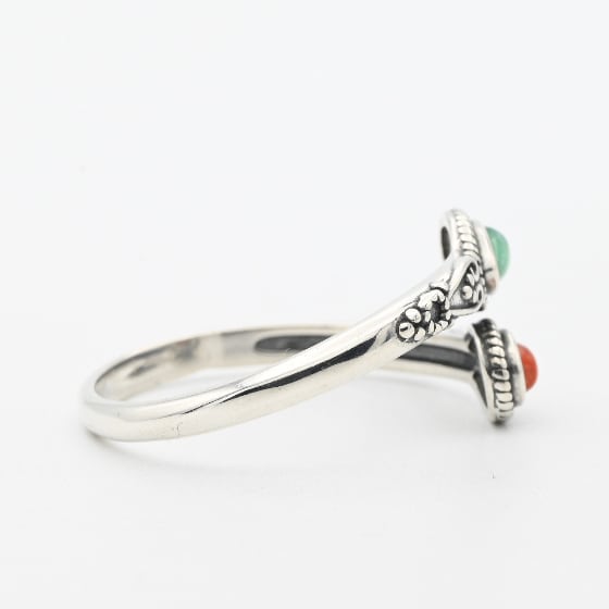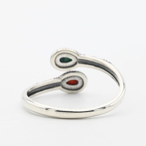 ハンドカットによる緻密な模様と、トップに煌めく2色のストーンが目を惹くラップリング。
