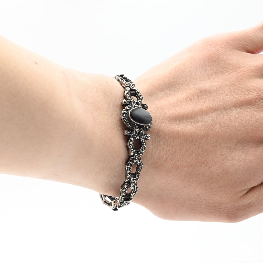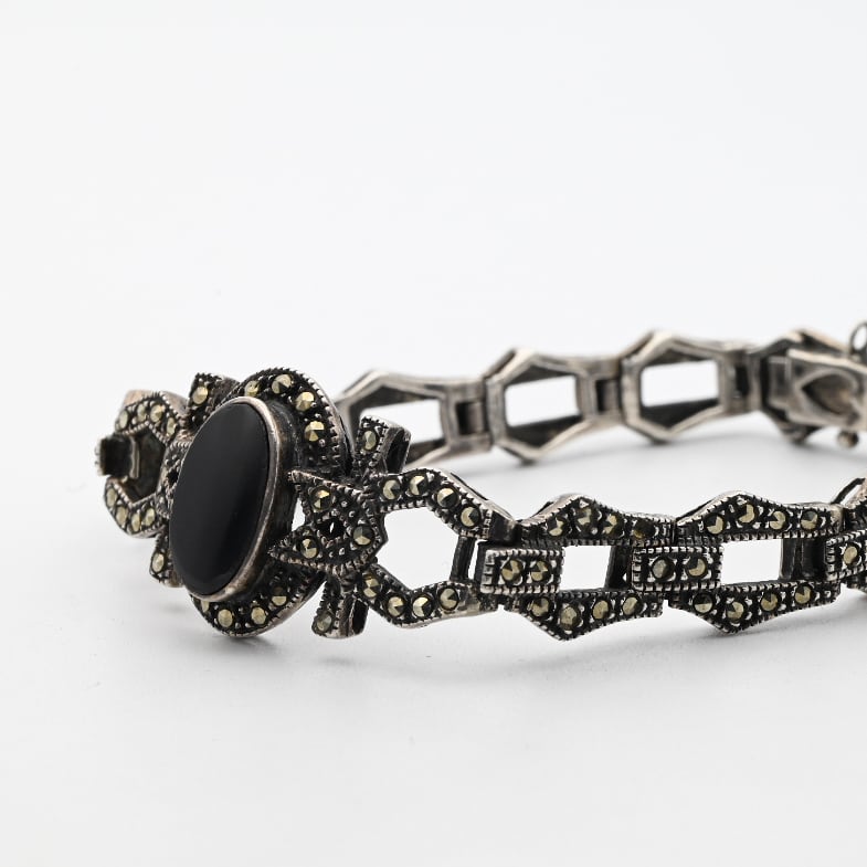 Black Onyx / Marcasites Accent Panel Link Bracelet / Denmark