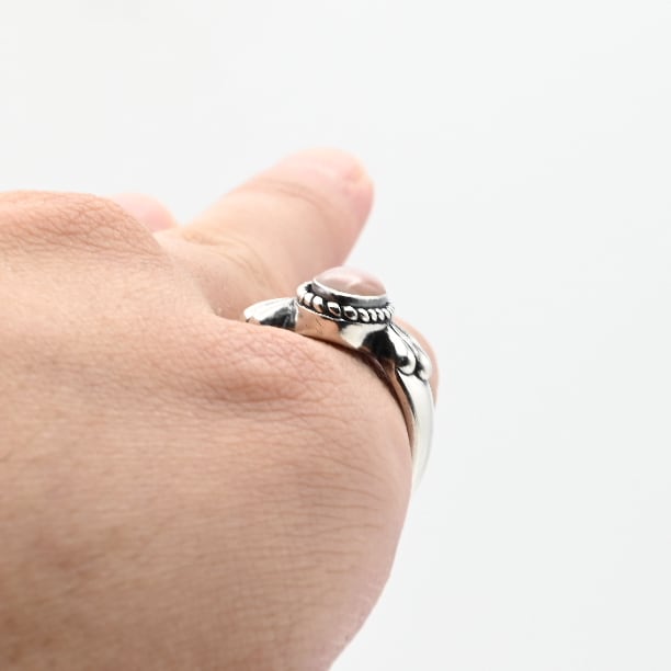 柔らかい印象のペールピンクのカラーリングと、エッジの効いた美しいデザインが目を惹くシグネットリング。