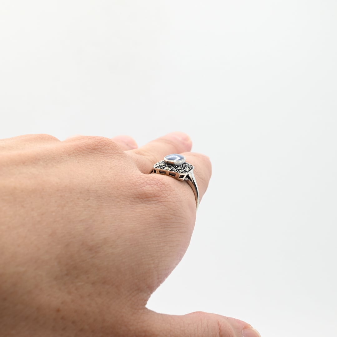 Blue Agate / Marcasite Accent Square Statement Ring #16.0 / Denmark