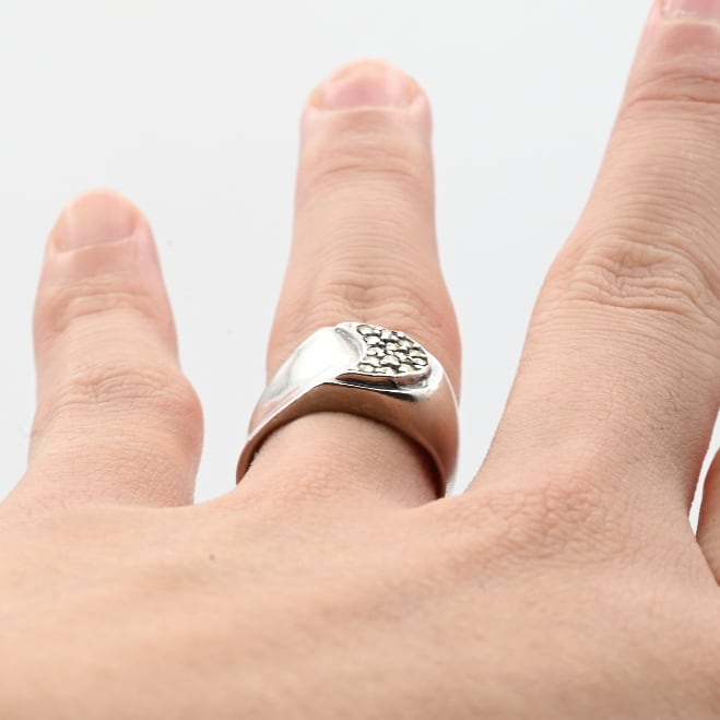 躍動感を感じるトップデザインで、多くの視線を釘付けにするシグネットリング。