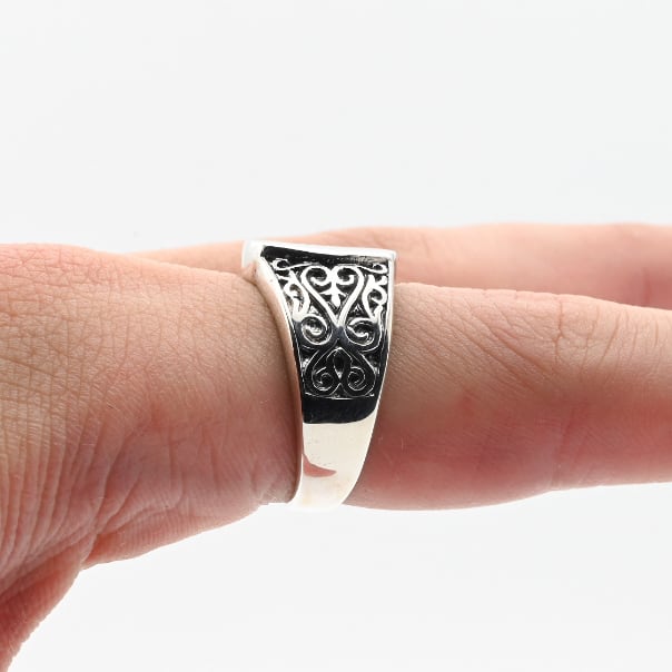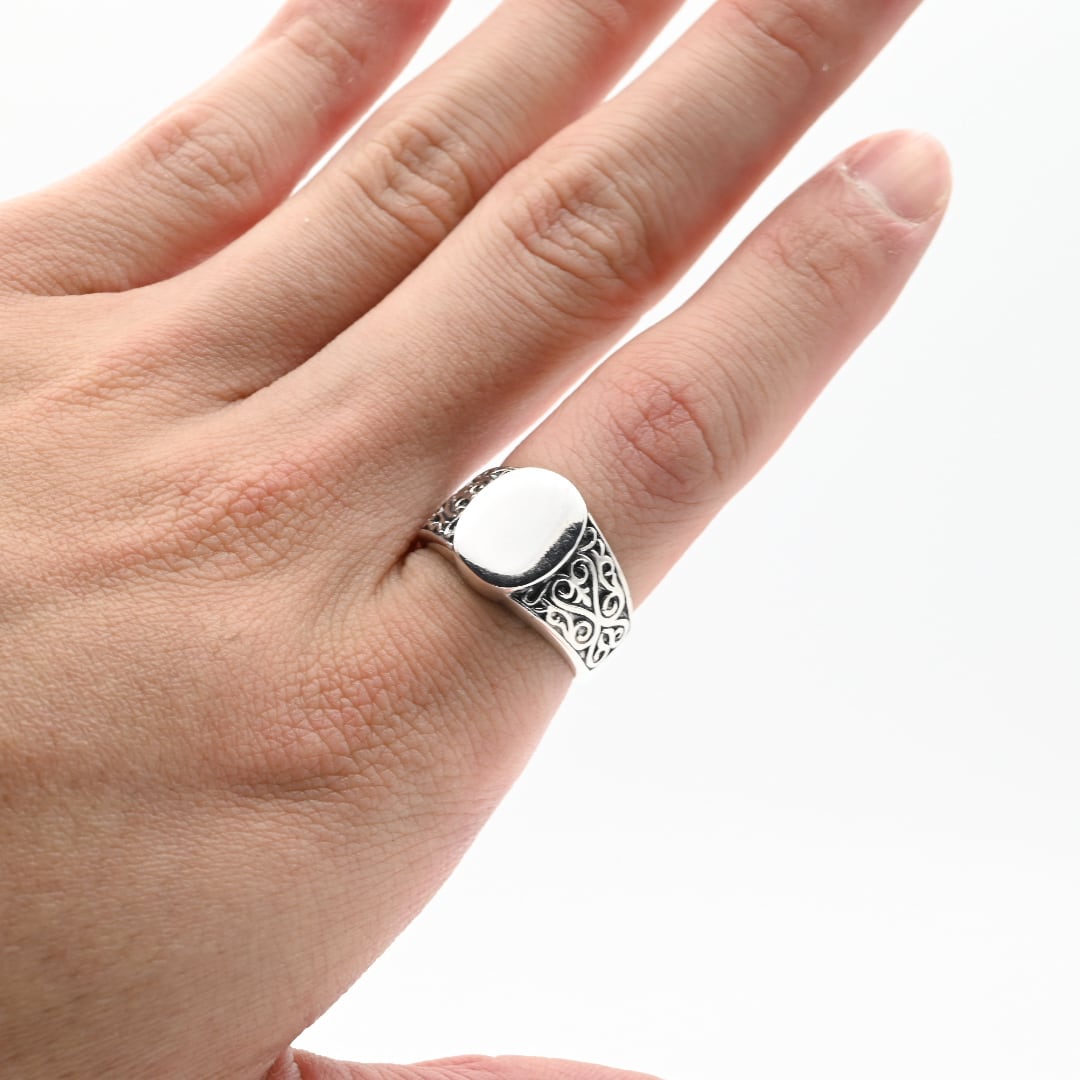 プレーンなトップと、手作業によって生み出された緻密で立体的なアームデザインとのコントラストが魅力のシグネットリング。