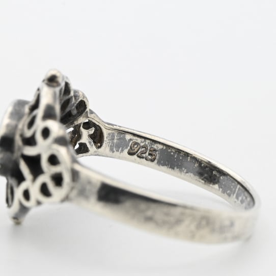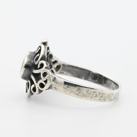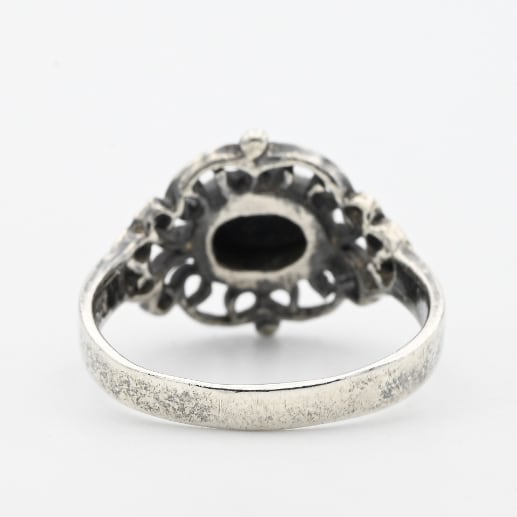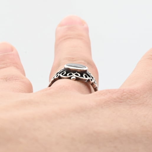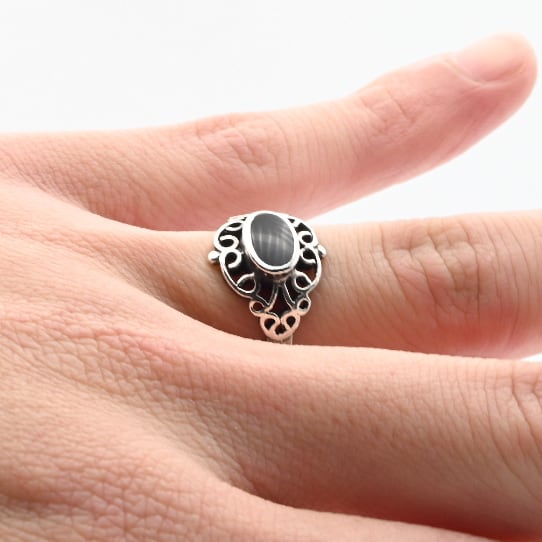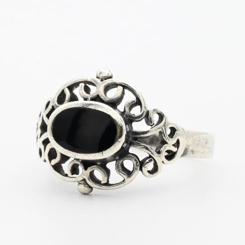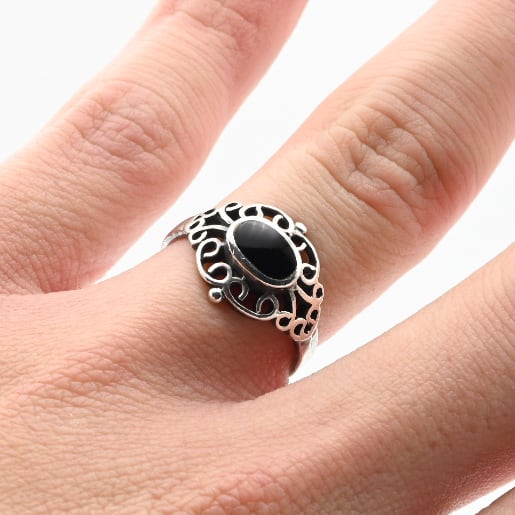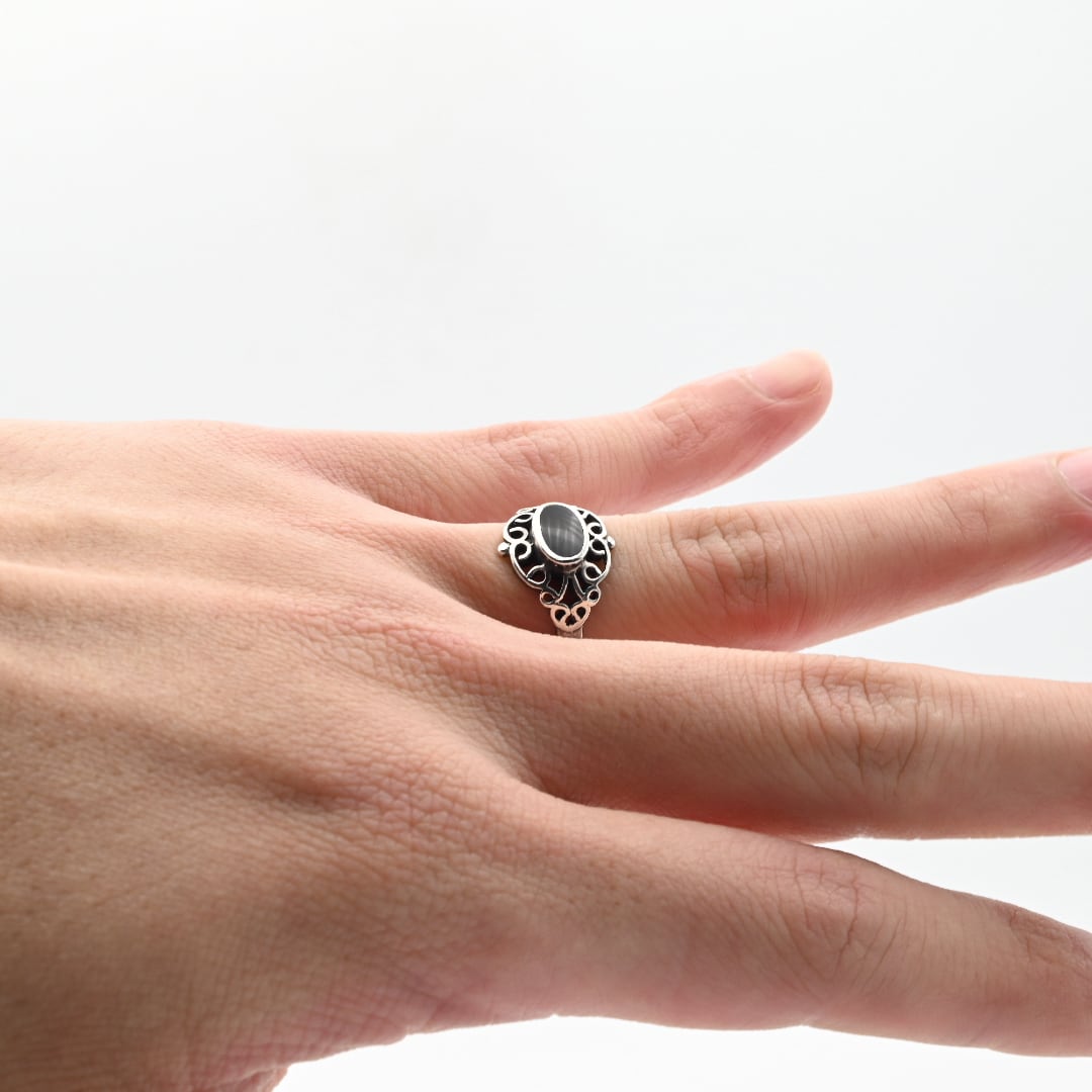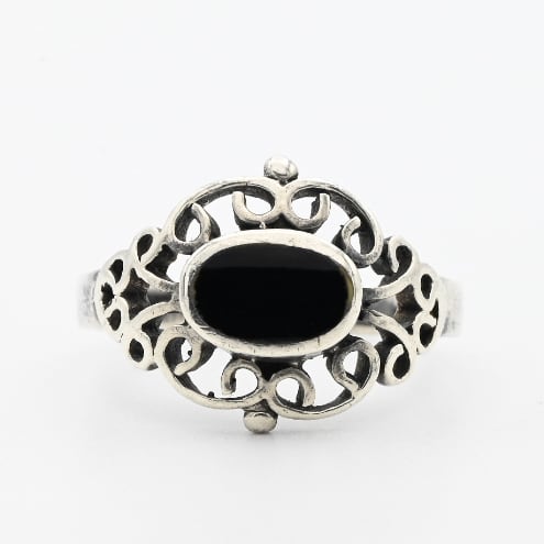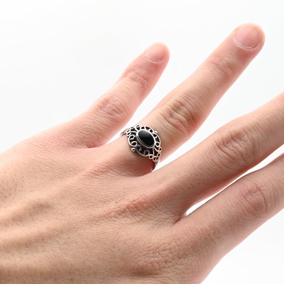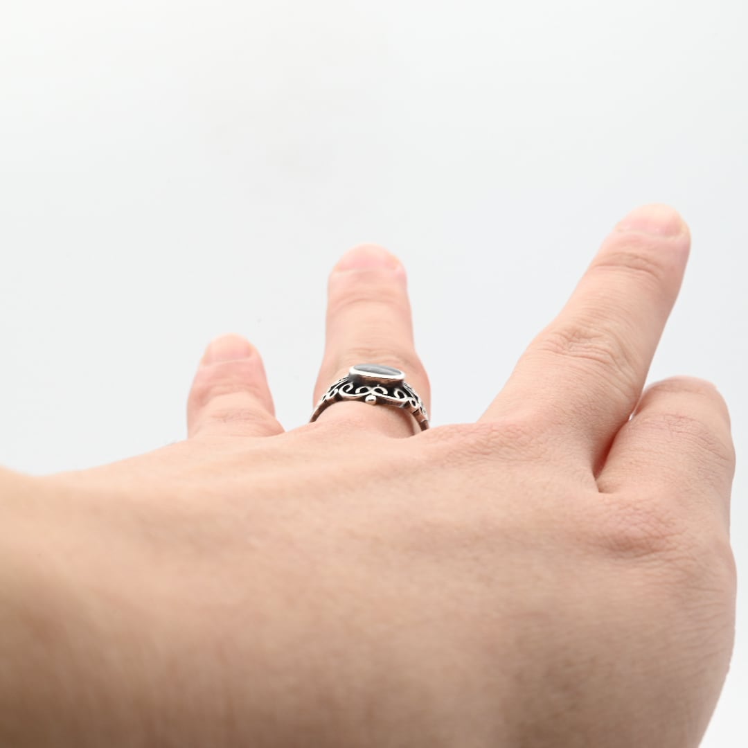 ハンドカットによって生み出された立体感を有する透かし模様と、トップに鎮座するブラックストーンが魅力のアイテム。