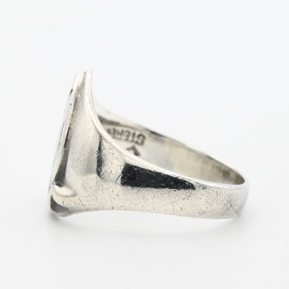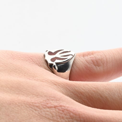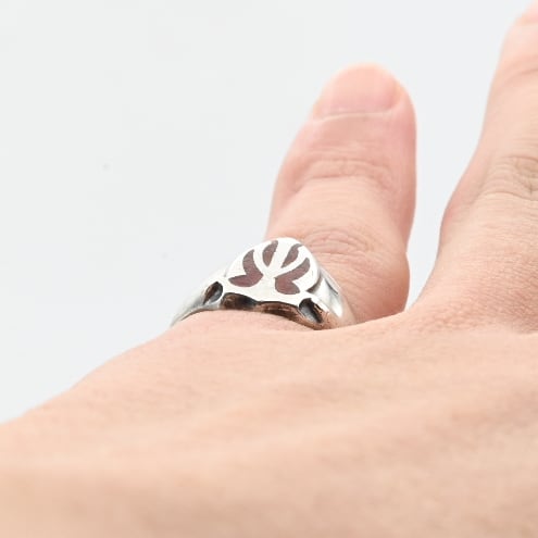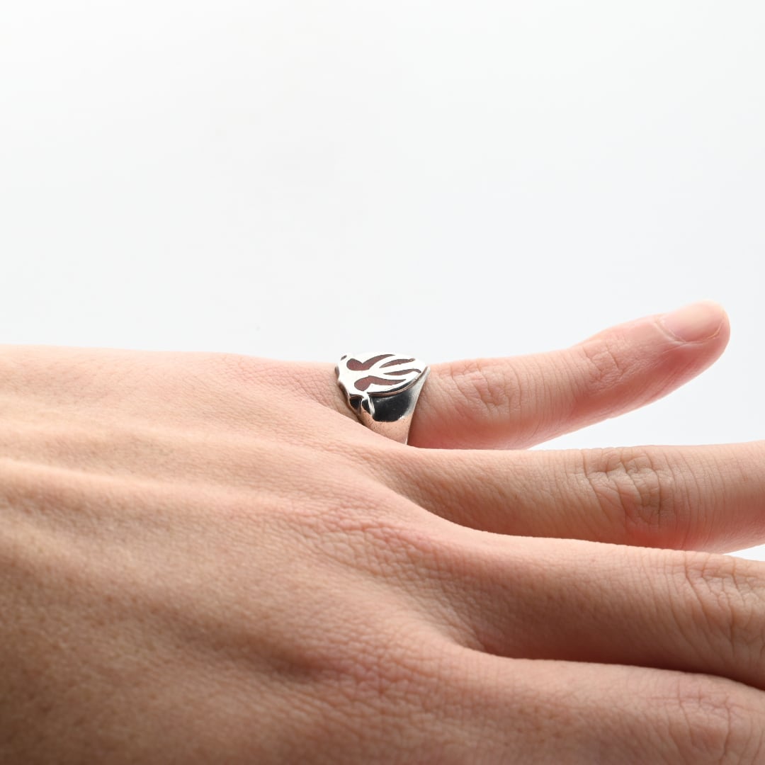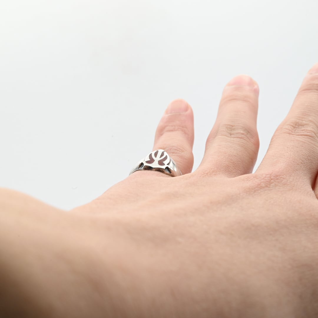 躍動感を有するトップシェイプと、そこに描かれた抽象的な模様が目を惹くシグネットリング。