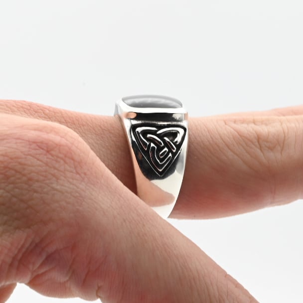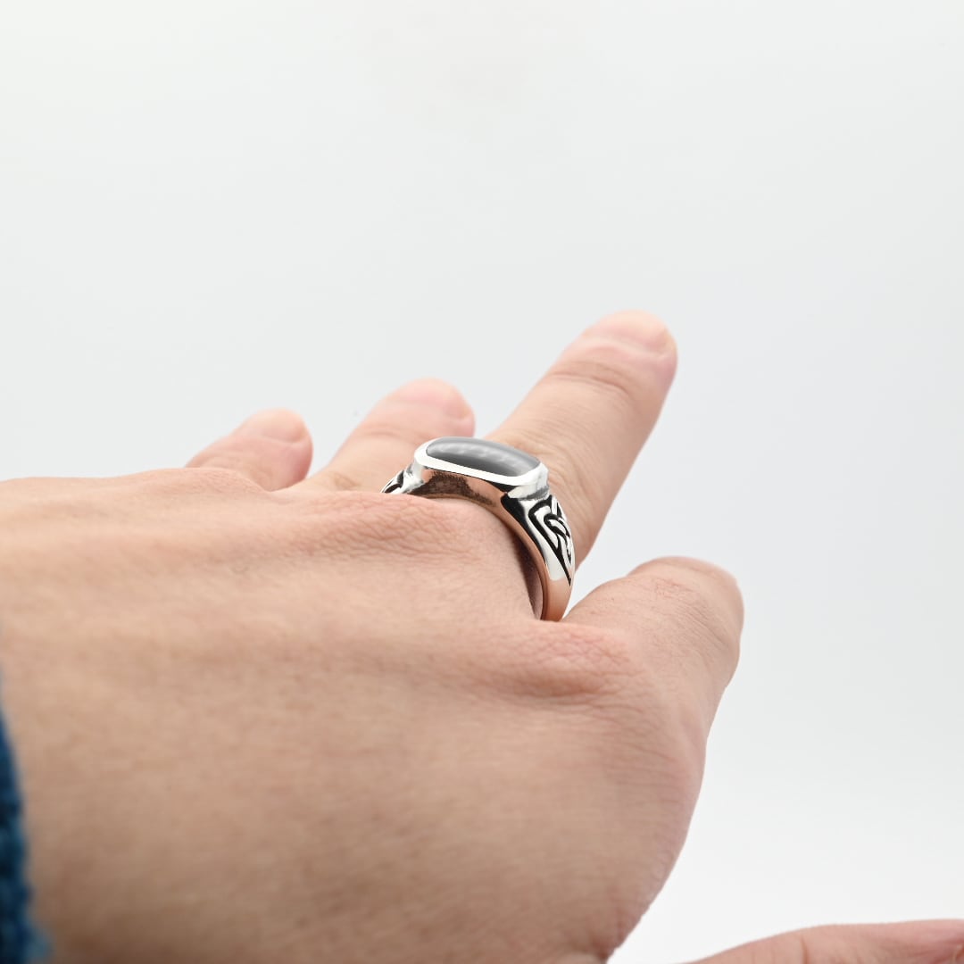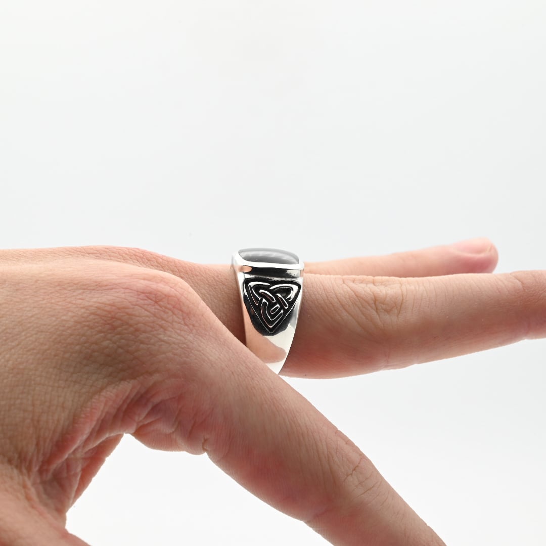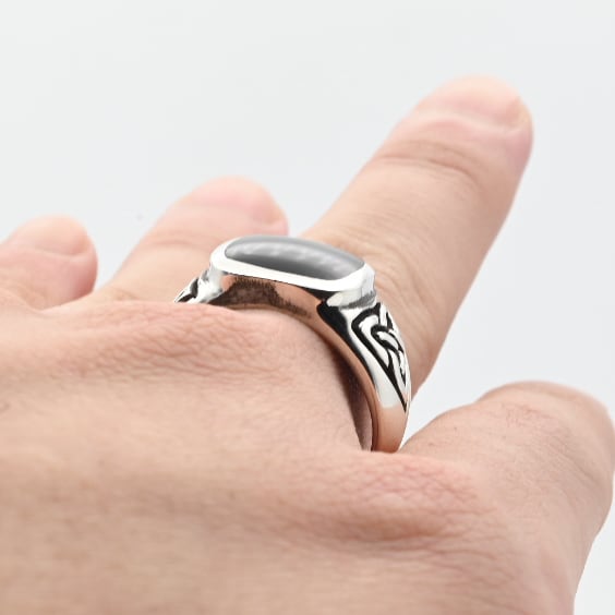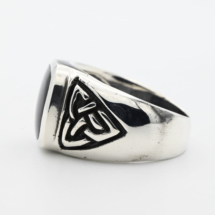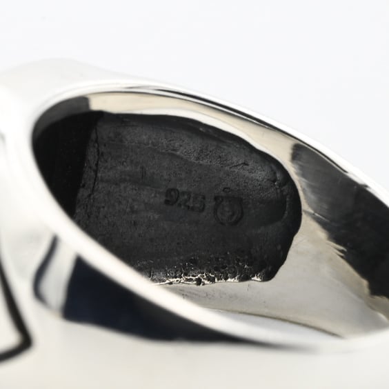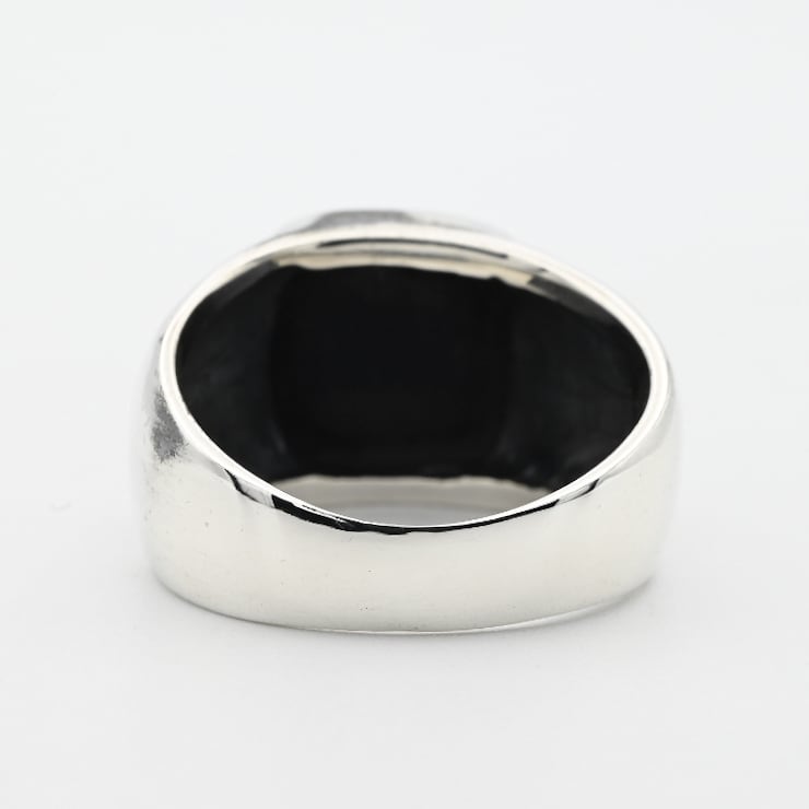 手作業で切り出された抽象的なデザインと、トップに鎮座するブラックストーンが目を惹くシグネットリング。