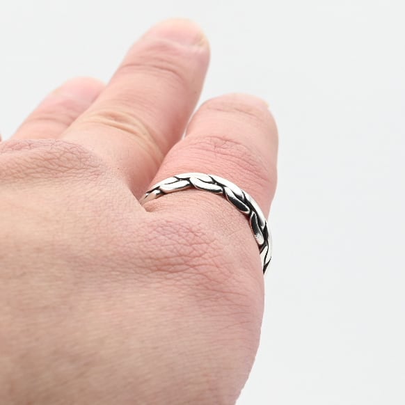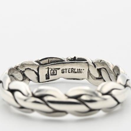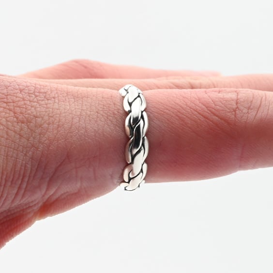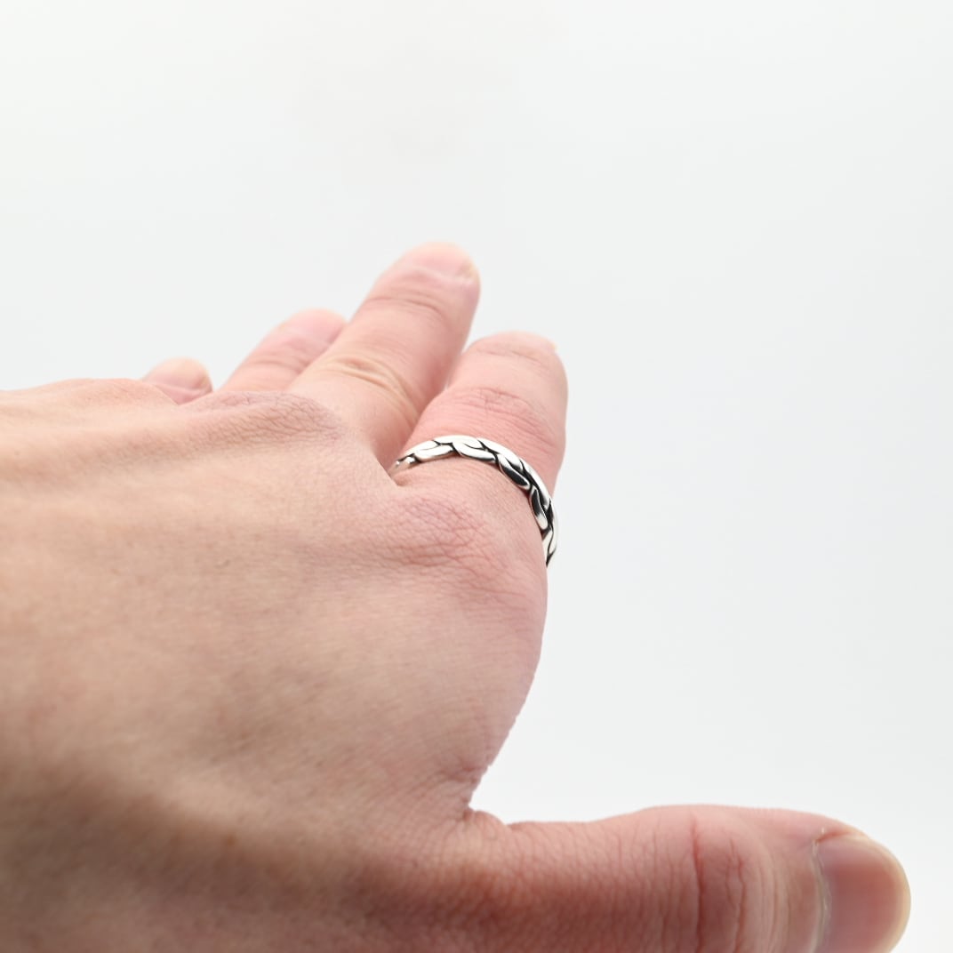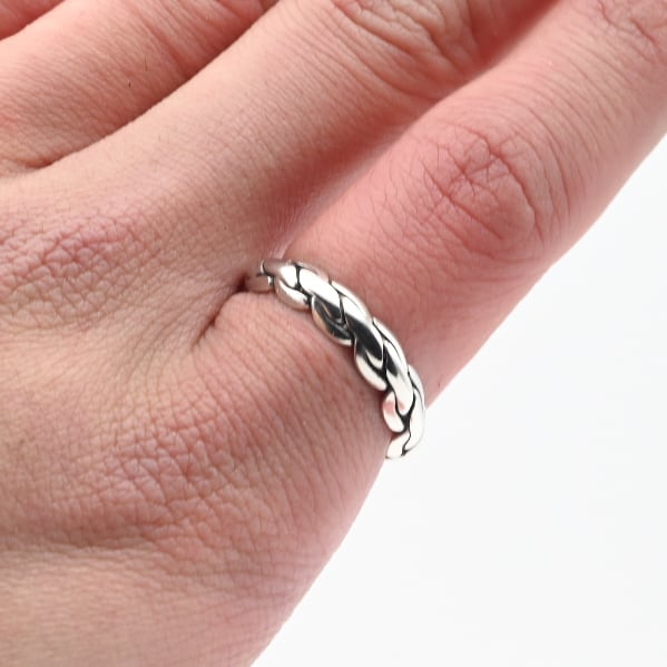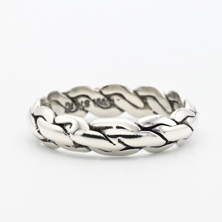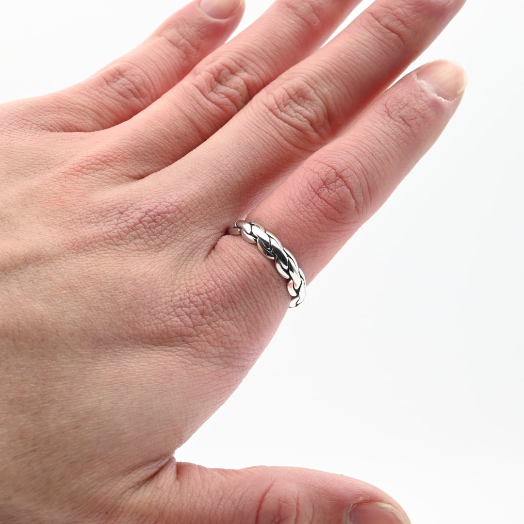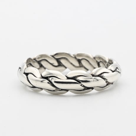 紐状に引き伸ばした、厚みを有するシルバーを実際に編み込んだリング。