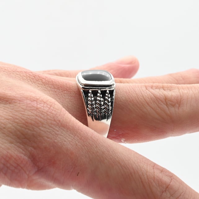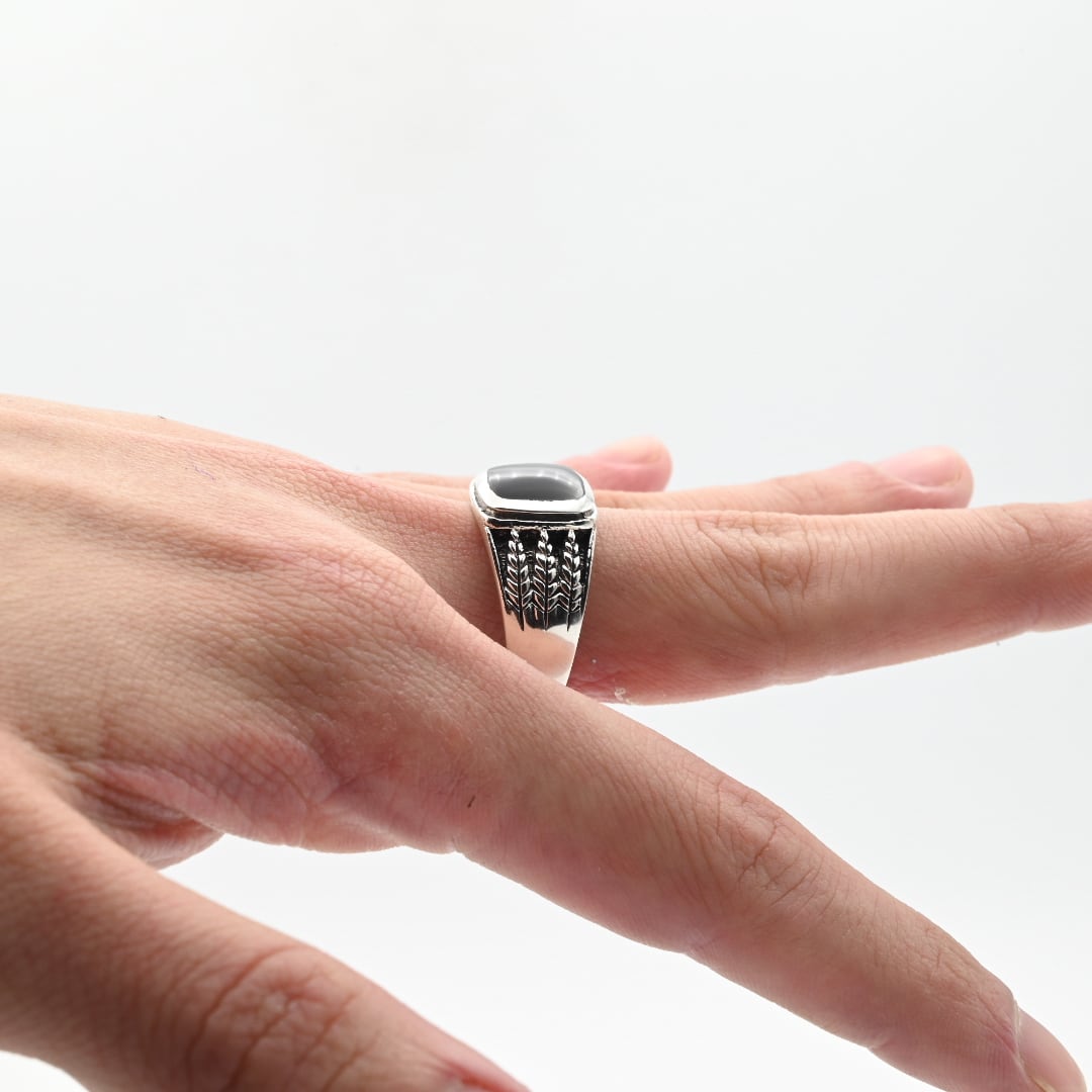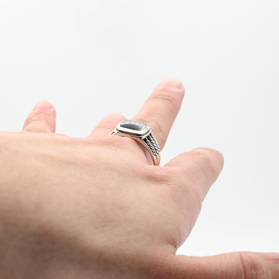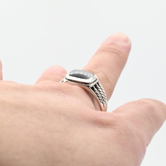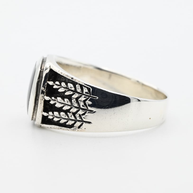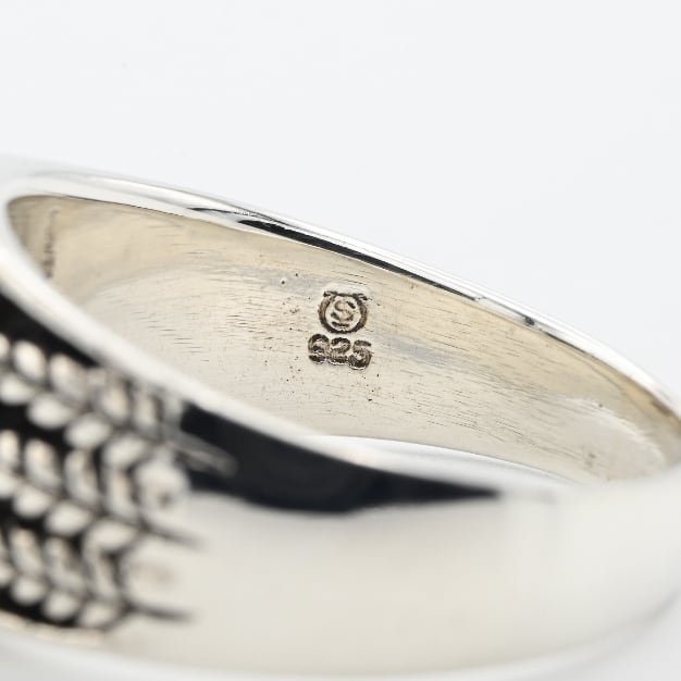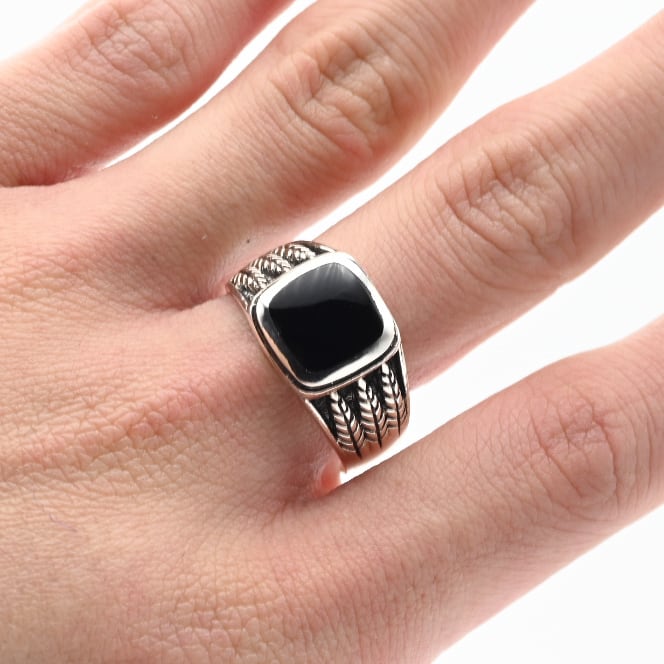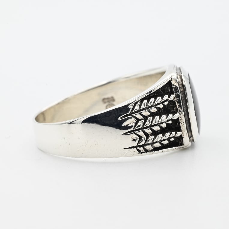 手作業で生み出された立体的なアームデザインと、トップに鎮座するブラックストーンが目を惹くアイテム。