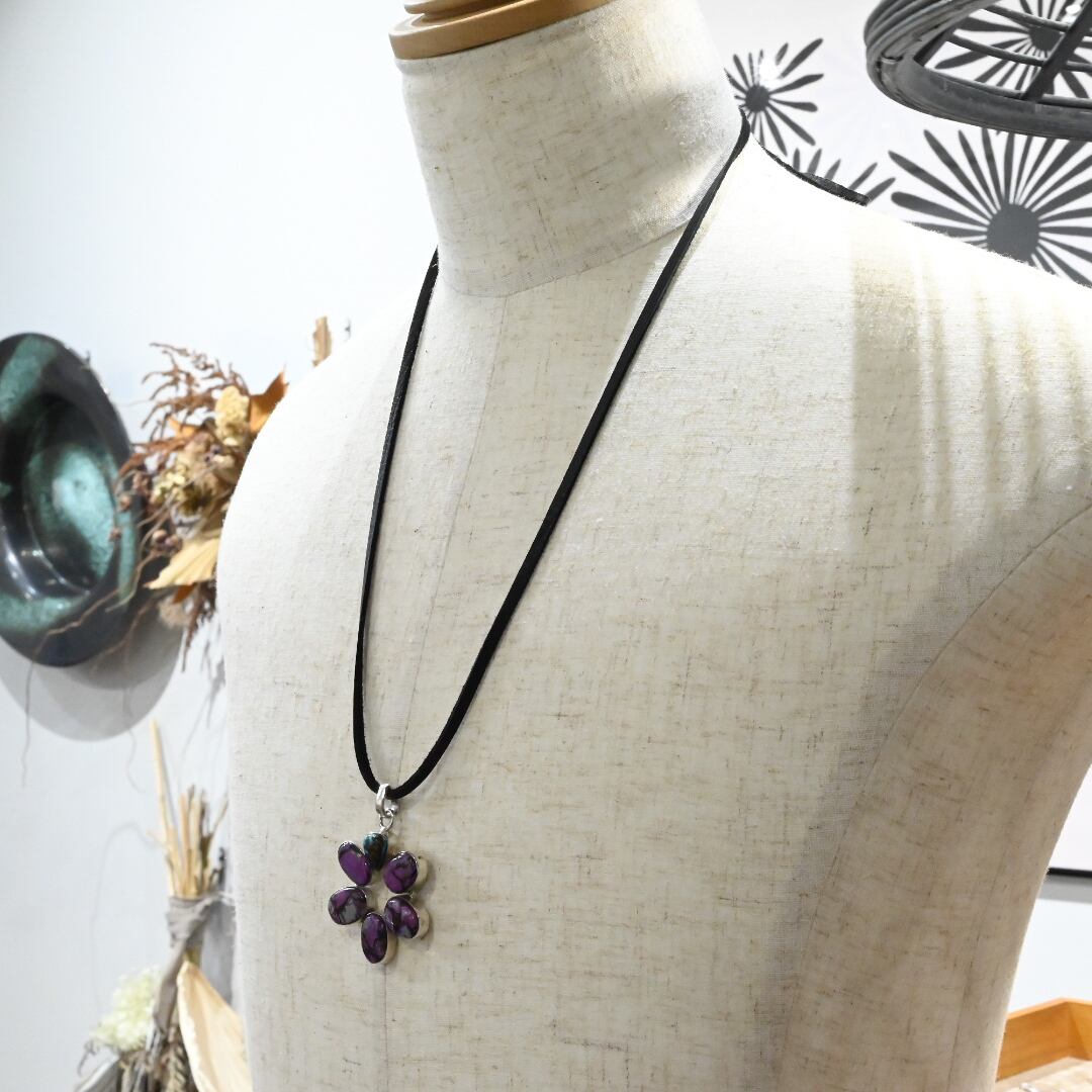 Purple Copper Turquoise / Turquoise Accent Flower Design Pendant Top With Deer Leather Strap / Denmark