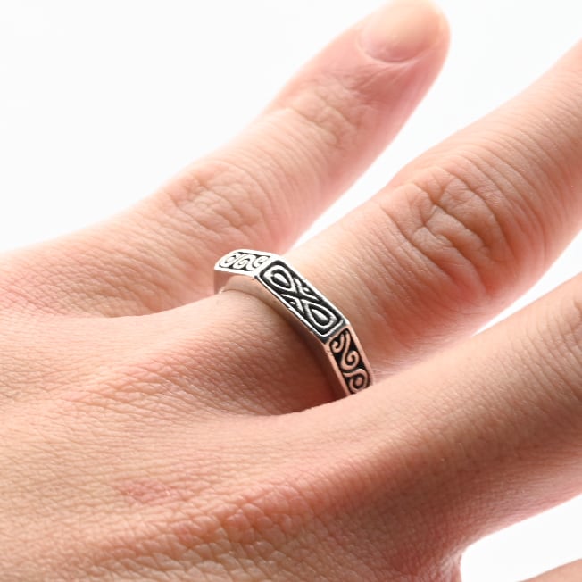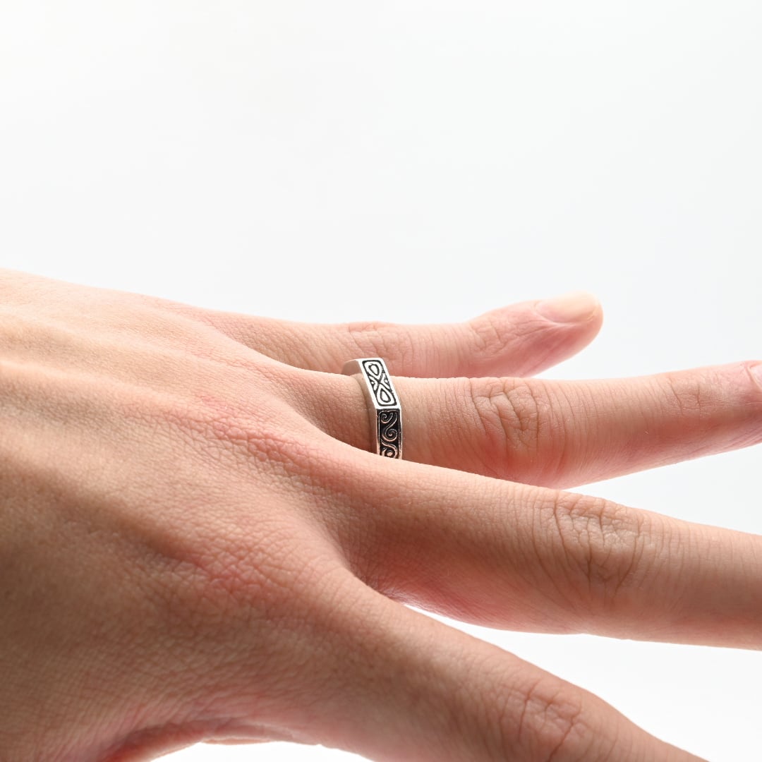 立体感を有するデザイン出しは手作業によって生み出されたもので、燻加工も相まって、メリハリの有る陰影をお楽しみいただけます。