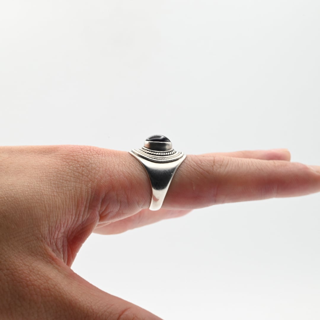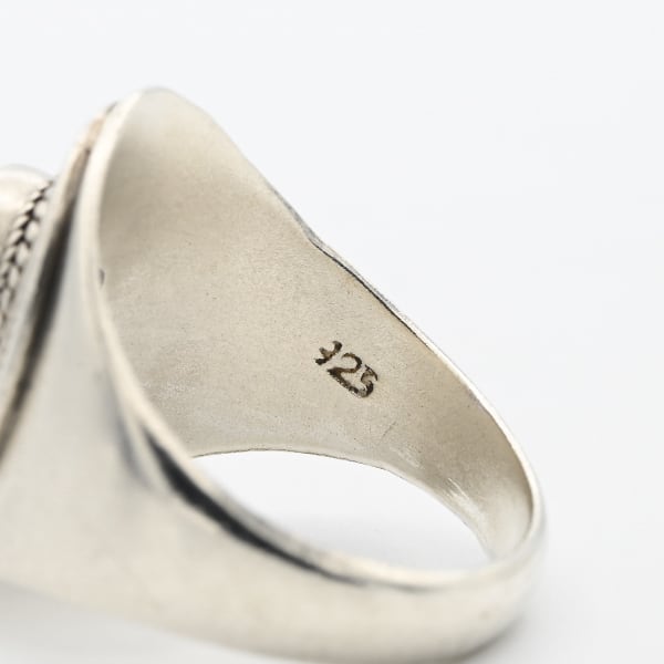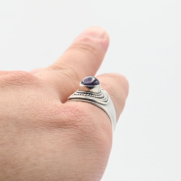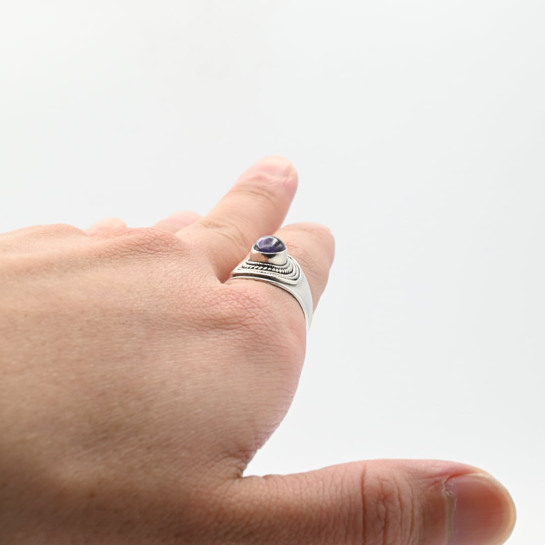 洗練されたデザインワークと、トップに鎮座するパープルストーンに目を奪われるアイテム。