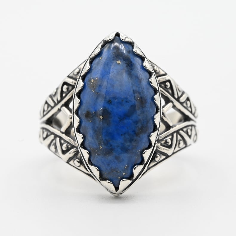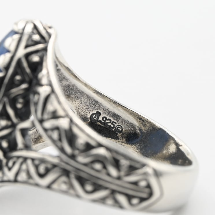 手作業で切り出された装飾的なデザインと、トップに煌めくネイビーストーンに心奪われるアイテム。