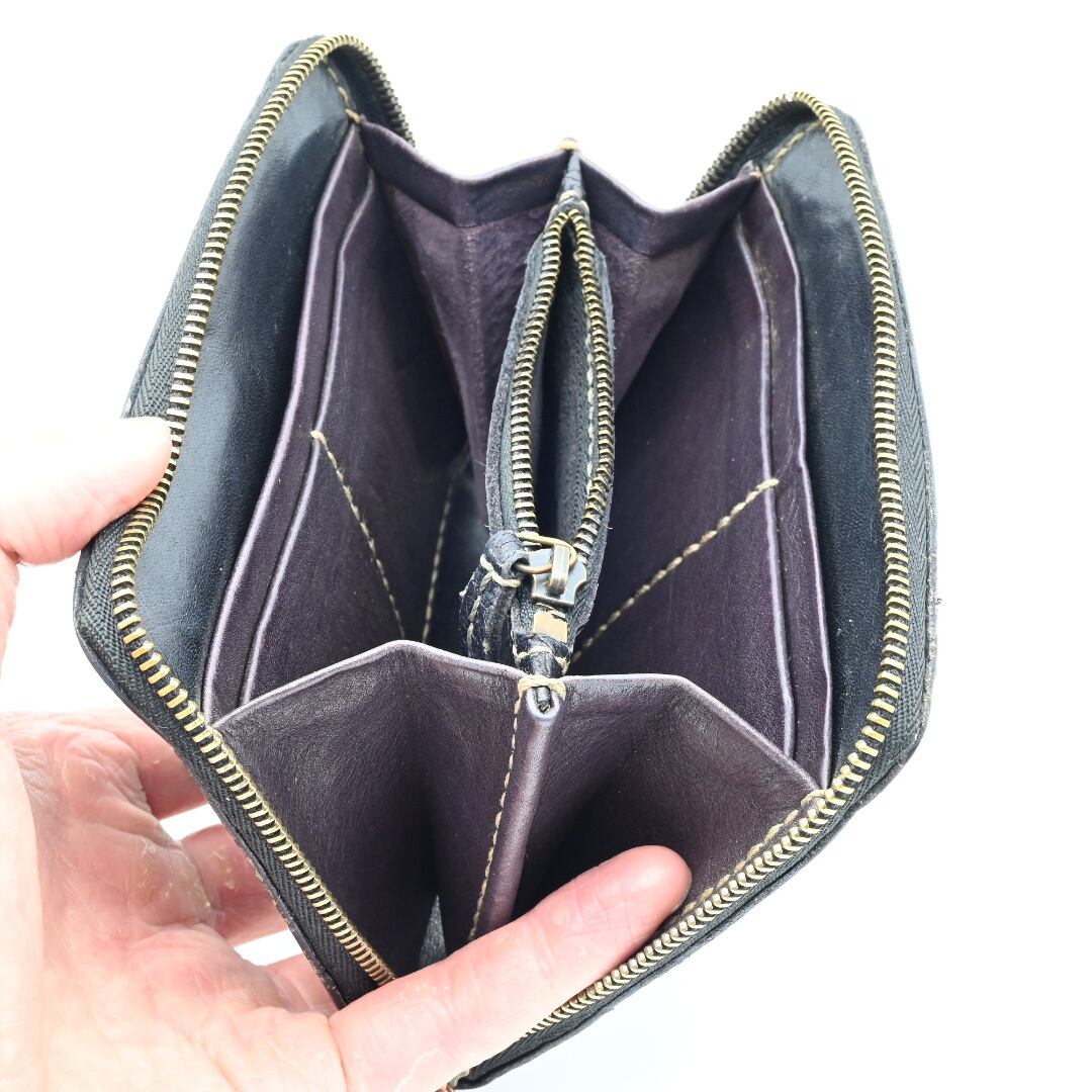 中身のスムースレザーに多少の色抜けがありますが、革にヘタリもなくファスナー開閉もスムーズで、状態の良い美品です。