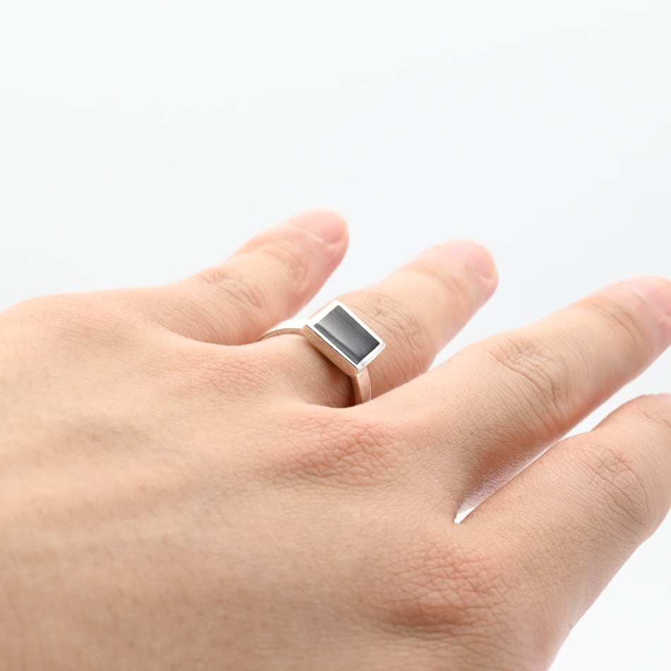 湾曲したスクエアトップ×ブラックストーンの異彩を放つ組み合わせが特徴のリング。