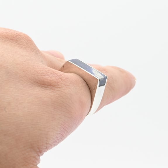 厚みの有るスクエアトップに天然石を配したリング。