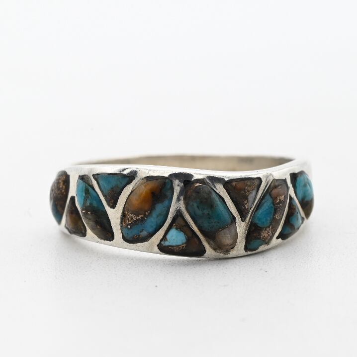 ターコイズと銅を圧縮し貼り合わせたコンポジットストーンで、銅の赤みとターコイズブルーのコントラストを楽しめる石です。